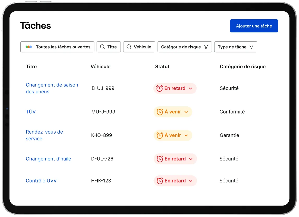 Dites adieu aux listes de tâches et aux feuilles de calcul encombrantes ! Vous pouvez différencier les catégories de risques et les états des tâches, ce qui vous aide à établir des priorités. Qu'il s'agisse de conducteurs, de véhicules, de dommages, d'amendes ou de tâches liées à l'approvisionnement, vous pouvez les consulter et les gérer au même endroit.