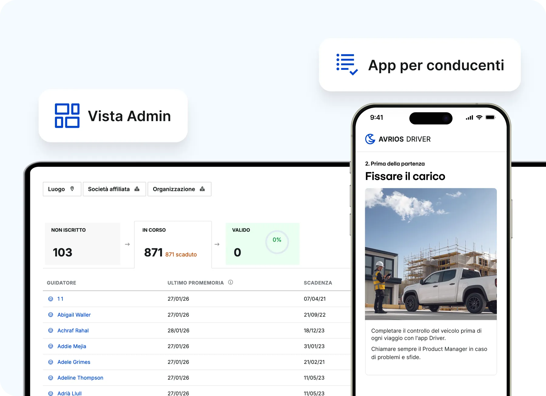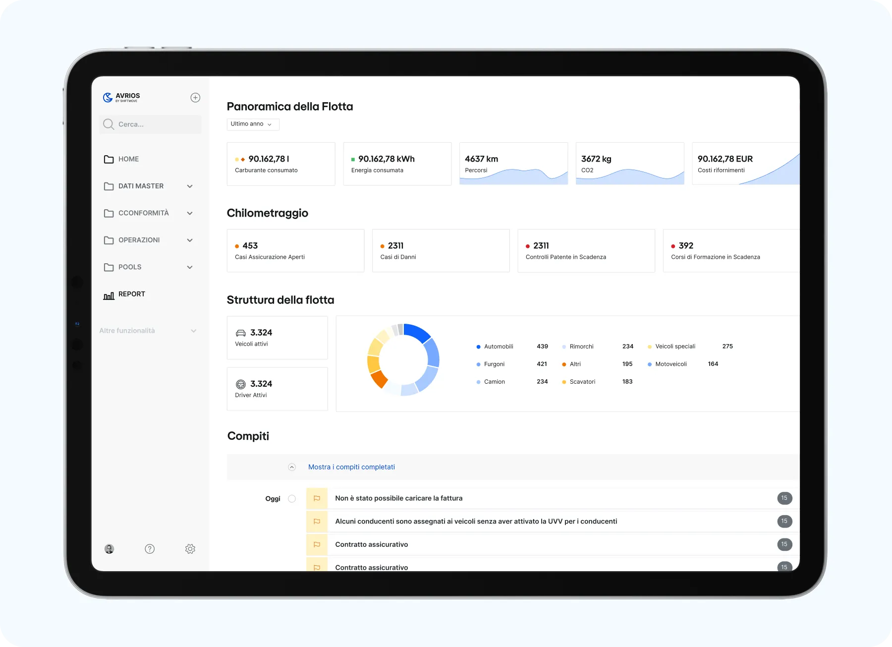 Avrios consolida i dati su veicoli, conducenti, costi e contratti in un unico posto, automatizza le attività ricorrenti e supporta la conformità ai requisiti legali come i controlli delle patenti di guida e le ispezioni UVV. Analisi e report avanzati aumentano la trasparenza su costi, utilizzo e potenziale di ottimizzazione.